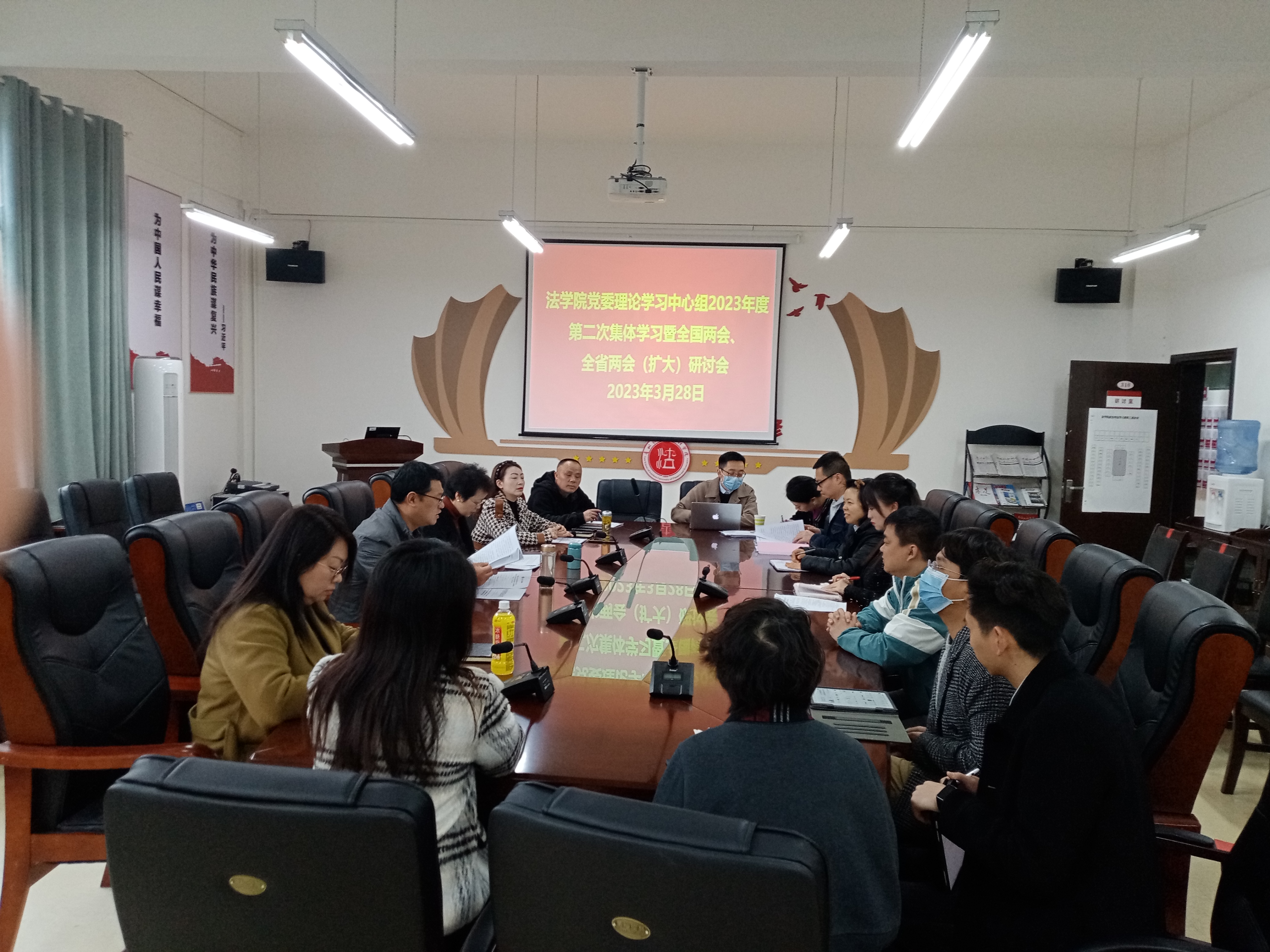 (法学院 图文/报道 徐方)2023年3月28日,法学院党委理论学习中心组在文德楼A8-310会议室召开2023年第二次集体学习暨全国两会精神、全省两会精神专题学习(扩大)研讨会。学院领导、副科级及其以上的工作人员参加会议。会议由学院党委书记詹伟主持。