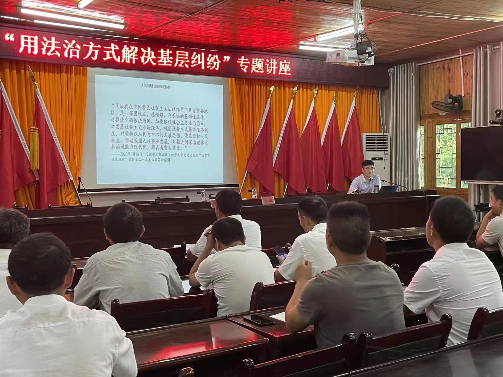在施洞镇政府,法学院乡村振兴团队的覃远春教授结合事前收集的普遍性的基层纠纷案例,以通俗易懂的语言,围绕民间借贷、担保、离婚冷静期、邻里纠纷等方面给镇干部和施洞镇所辖各村的调解员上了一堂“用法治方法解决基层纠纷”的专题讲座,讲座后覃远春与参会培训人员还进行了沟通和交流,耐心细致地解答了参会培训人员咨询的法律问题。