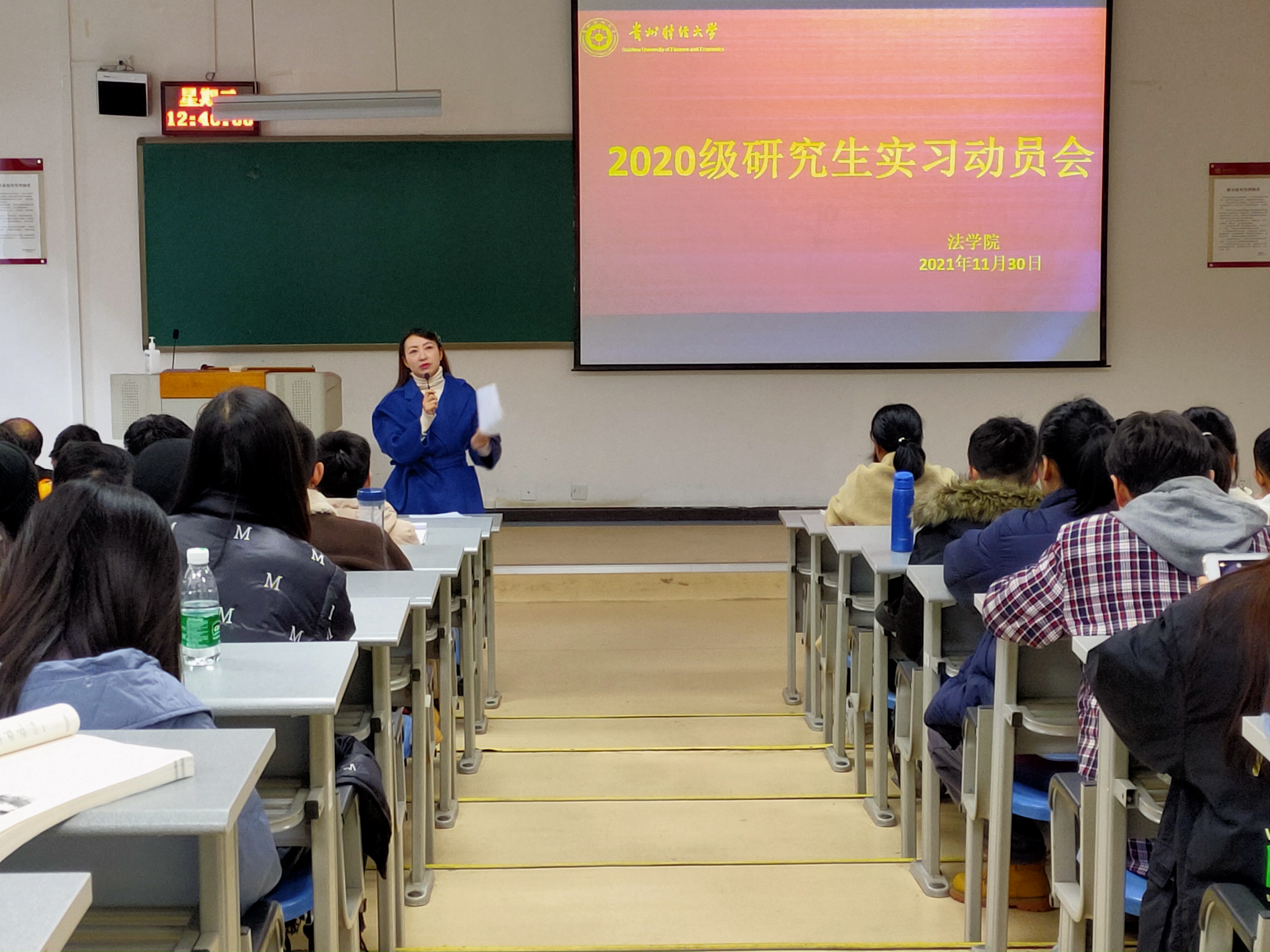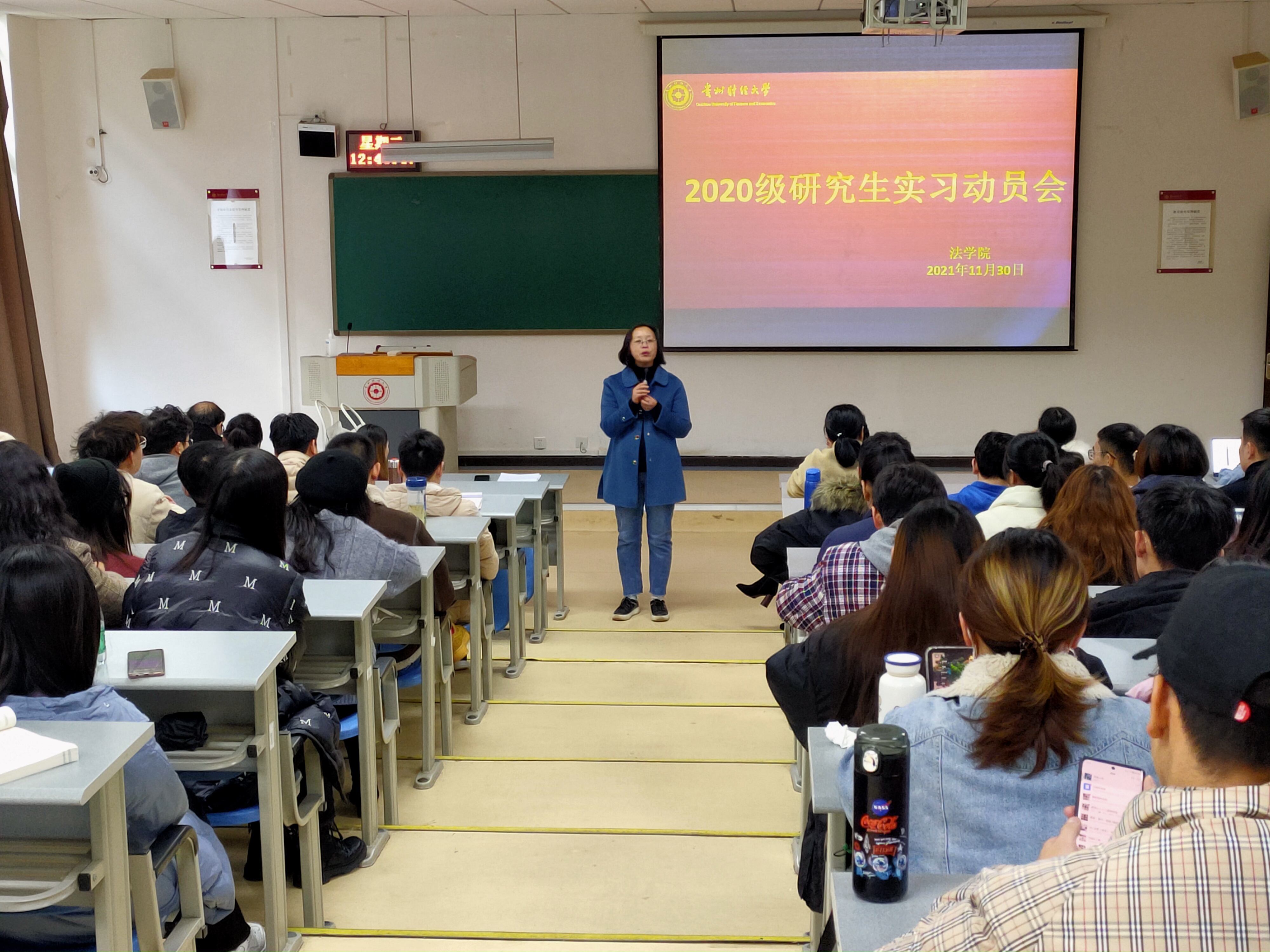 (法学院 孔娴 报道/摄影 粟振江)11月30日中午,法学院2020级研究生实习动员大会在乐学楼阶梯1-2教室举行。法学院党委副书记、院长陈玉梅、党委副书记彭华、党委委员宋昭澜、研究生导师代表兰美海、学科办李玉兰和魏晓瑞、辅导员杨兴莉及法学院2020级全体研究生参会。会议由宋昭澜主持。
