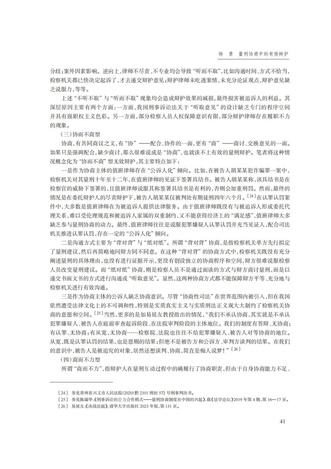 摘要:在我国刑事司法实践中,长期存在“三重三轻”现象:“重定罪、轻量刑”,“重无罪辩护、轻量刑辩护”,“重自由刑辩护、轻财产刑辩护”,量刑裁量与量刑辩护未引起应有的重视,量刑不公成为普遍性问题。在协商性司法的潮流下,量刑协商走过了一条从禁忌到‘星星之火’的演进之路,以量刑协商为中心的量刑辩护的重要性日益凸显。然而,量刑协商程序中常存在无效辩护情况,表现为“不听不取”“听而不取”“协而不商”“商而不力”等四种形态。量刑协商有效辩护的本质内涵是通过实质化的量刑协商实现有利于被追诉人的量刑结果,其判断标准应从‘尽责辩护’与‘有效果辩护’双重角度进行考察,具体可从协商主体、协商筹码、协商方式、协商效果等四个方面予以厘定。在我国即将迎来刑事诉讼法第四次修改之际,为保障量刑协商中有效辩护的实现,应当秉持有效辩护理念,在吸收司法改革成果和实践经验的基础上,从立法设计、配套规范、实操方案等路径进行完善。