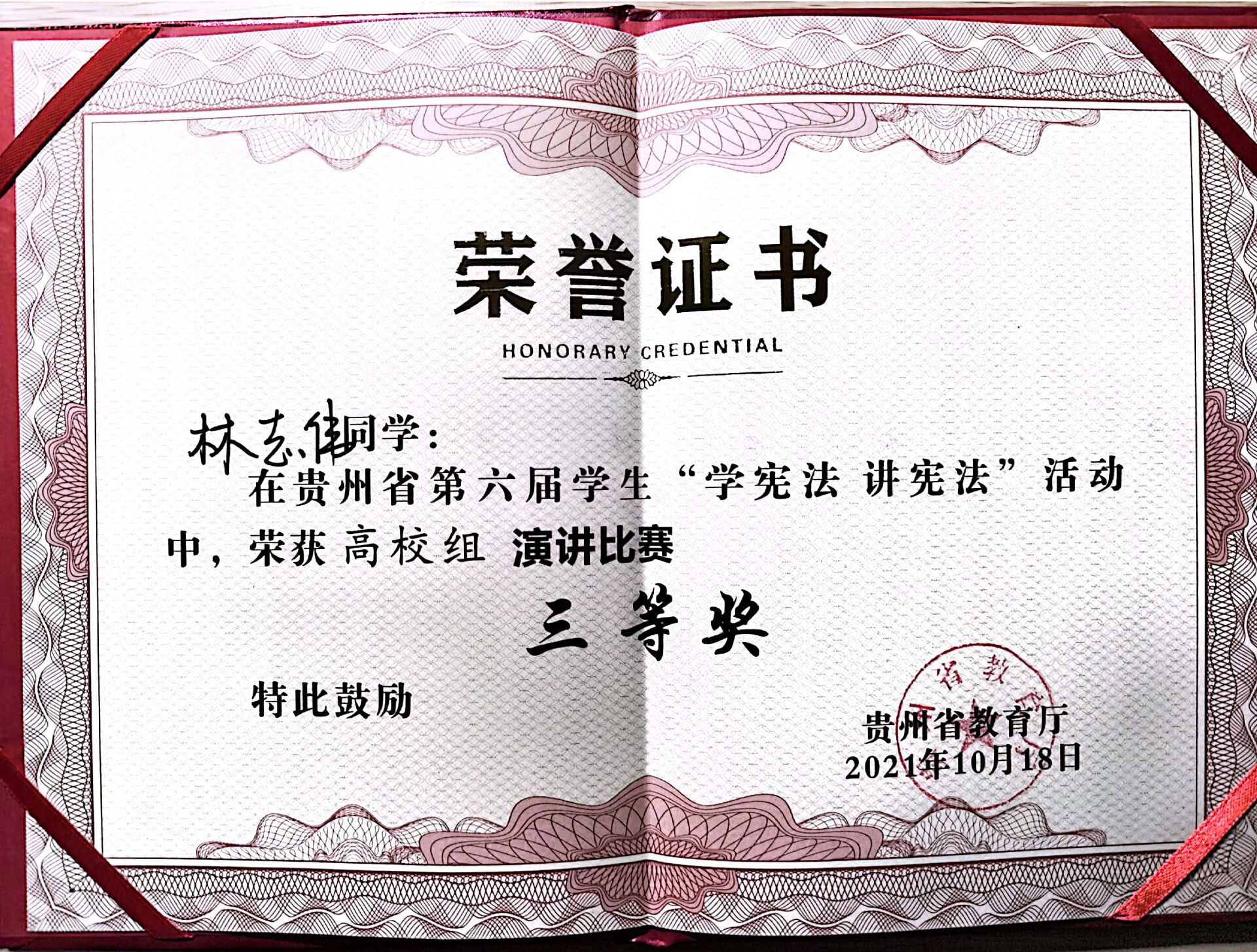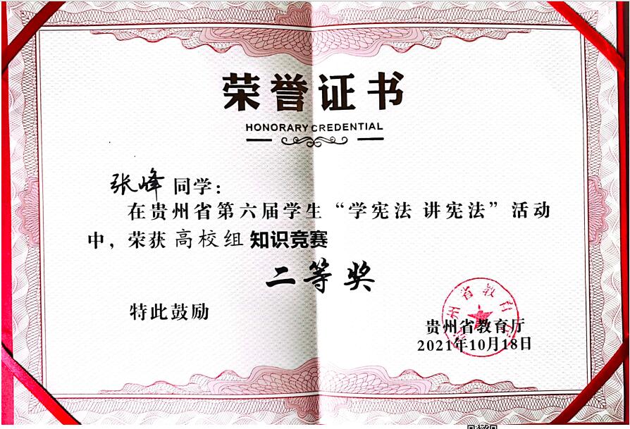 10月18日,由省教育工委、省教育厅主办,贵州民族大学承办的全省第六届学生“学宪法 讲宪法”活动总决赛在贵州民族大学举行,火狐电竞(中国)官方网站法学院学子张峰、林志伟经过多轮激烈比拼后,晋级总决赛,同来自全省各高校的参赛选手进行角逐。最终张峰同学荣获知识竞赛二等奖,林志伟同学荣获演讲比赛三等奖。