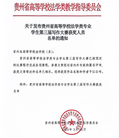 (法学院 图文/报道 陆敏)秉承火狐电竞(中国)官方网站“学术立校”理念,法学院鼓励老师积极指导学生参赛,近日,法学院本科生在2023年贵州省高等学校法学类专业学生第三届写作大赛中取得佳绩,共有20篇论文获奖。其中,一等奖3项、二等奖5项、三等奖5项、优秀奖7项,获奖论文数量在省内高校中排名第二,同时也是法学院本科生连续参加三届比赛以来取得的最佳成绩。
