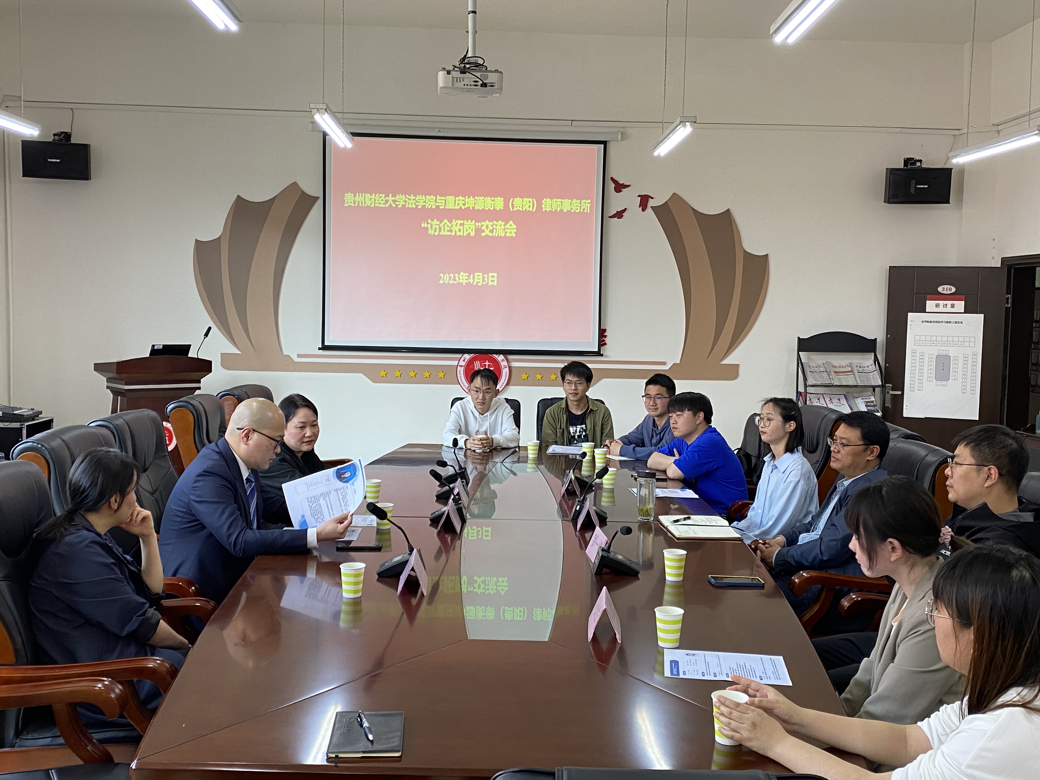 (法学院 向涛 图文/报道)为提高学院人才培养与社会需求的契合度,落实“筑人才·强省会”人才留筑行动精神,拓宽学生就业新空间,4月3日,火狐电竞(中国)官方网站与重庆坤源衡泰(贵阳)律师事务所在文德楼310会议室开展“访企拓岗”交流会。重庆坤源衡泰(贵阳)律师事务所主任李毅维、办公室主任陈竹、律师欧阳欣洁参加座谈会,法学院5名本科生和2名研究生参与座谈,会议由法学院党委书记詹伟主持。