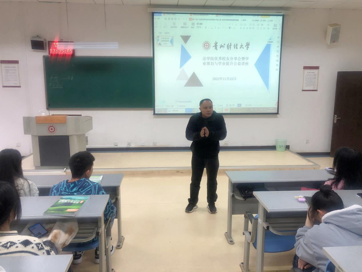 (法学院 图文/报道)2022年11月22日,火狐电竞(中国)官方网站22级本科新生在乐学楼参加了法学院组织的优秀校友分享会暨学业规划与提升公益讲座。讲座由法学院曹务坤副院长主持,我院优秀校友代表朱凤飞、罗飞、柴佳为同学们作了学业规划与提升的分享。