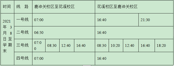 现将2020-2021学年第二学期工作日交通车运行时间和线路调整后通知如下: