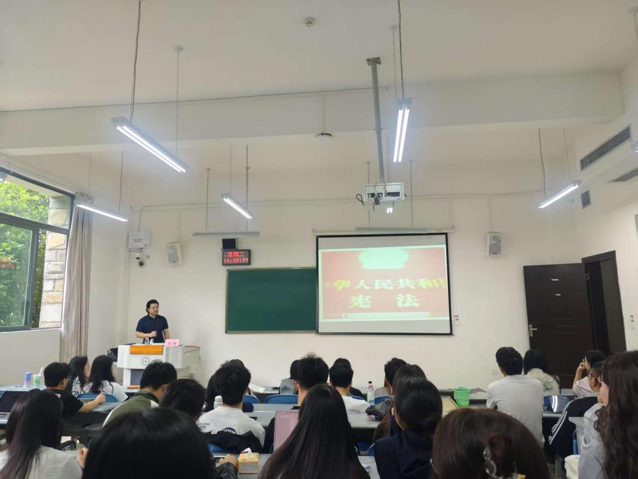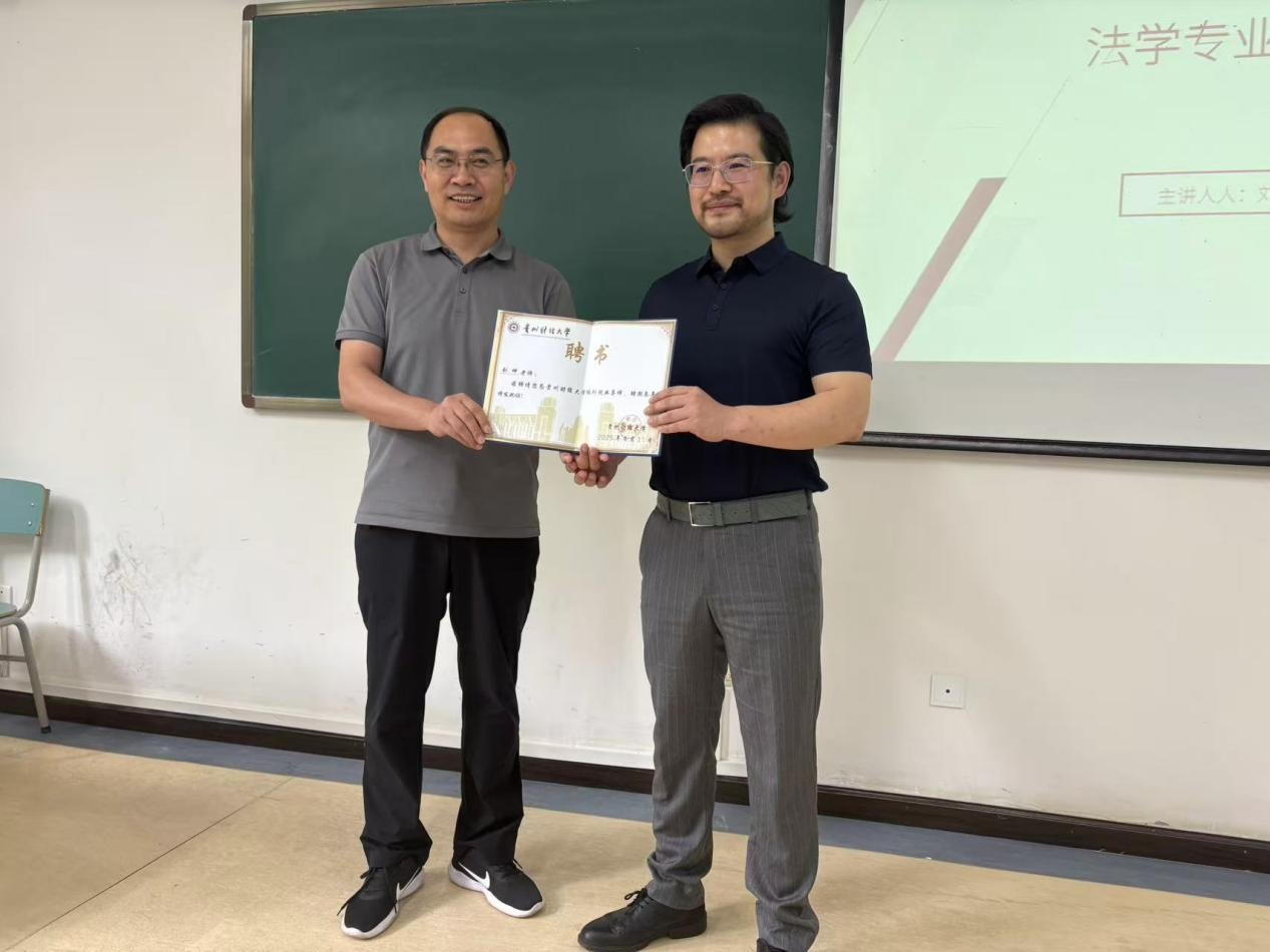 (法学院 胡小玲 张云舒 报道|摄影 )为助力学生明晰职业方向,增强职业规划能力,法学院于6月3日在文德楼103教室举办《法学专业就业和职业选择》专题讲座。本次讲座特邀贵州公成律师事务所主任刘坤授课,法学院党委书记邵新顺出席并为刘坤颁发贵州财经大学校外就业导师聘书,120余名师生参加本次讲座。