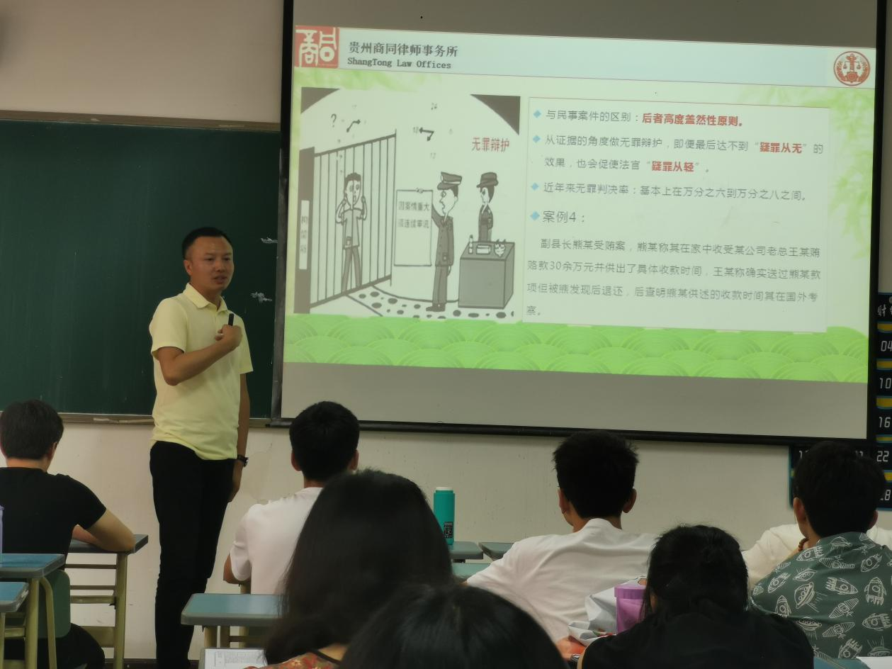 法学院通过“师生座谈、为群众办实事”,了解到学生对于法律专业知识学习的需求外,急需法律实务相关知识的补充。为增强学生的法律实务相关知识,提高学生的法律实务水平,法学院于6月8日在博学楼1-10特邀贵州商同律师事务所合伙人王军(贵州省人民检察院专家咨询委员、贵阳市人民监督员、贵阳市人民检察院专家委员会委员、听证员)作“律师办理刑事案件中的策略与技巧”的专题讲座。讲座由何鹏老师主持,法学院研究生导师王霖和辅导员杨兴莉列席,我院60余名本科生和研究生参加。
